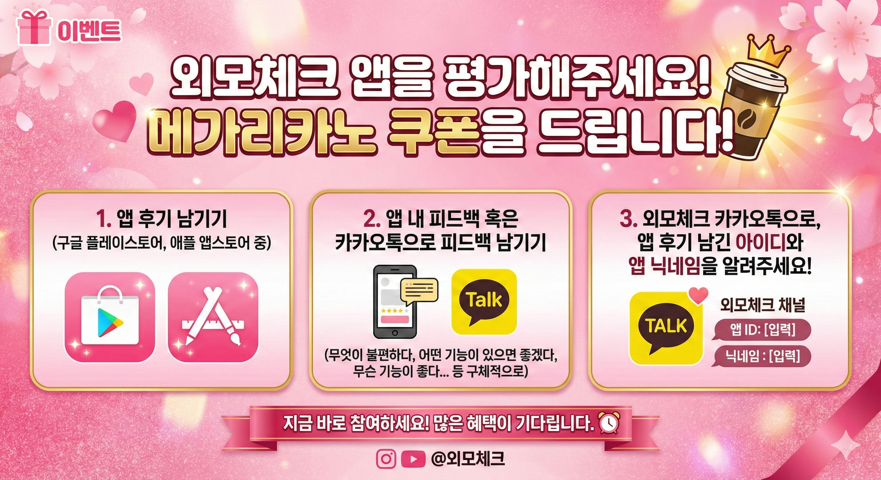 커뮤니티 > 게시글외모체크 피드백 이벤트 (메가커피)운영작성자 운영자우리 정말 잘 하고 싶어요...! 아무도 책임지지 않는 나의 외모, 믿을 건 외모체크! (앱을 업데이트 하세요!)좋아요 4댓글 1조회 23